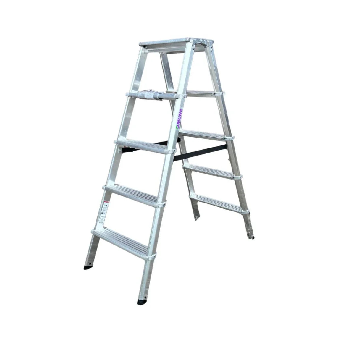 MUNK Stufen-Stehleiter ML 11235 - 2x5 Stufen - beidseitig begehbar aus Aluminium. Hochfest verschraubte Stufen-/Holmverbindung, 2-fach verschraubtes, massives Leitergelenk aus Zink-Druckguss und rutschsichere Leiterschuhe.